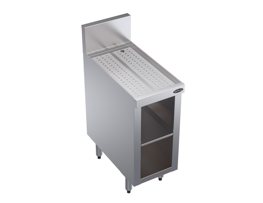 Royal Series Underbar Drainboard with open cabinet base, 12″W x 24″D, embossed drainboard top, open front cabinet base, stainless steel top, front, & sides, stainless steel legs with adjustable thermoplastic bullet feet, NSF (Midshelf optional, not standard)