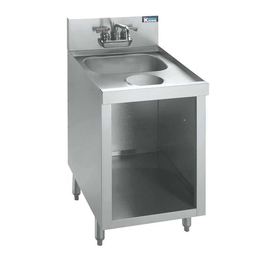 Royal Series Underbar Hand Sink Unit, open front cabinet base, 18″W x 24″D (to match speed rail depth), 14″ wide x 10″ front-to-back x 10″ deep sink, splash mount Royal Series faucet, (1) 9″ overflow standpipe, 6″ waste chute, stainless steel top, front, & sides, stainless steel legs with adjustable thermoplastic bullet feet, NSF