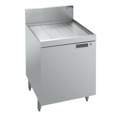 The Krowne KR24-SD18 underbar glass storage unit has a 7-inch backsplash to protect the wall from water and other damage. It installs to a 1-inch drain connection to facilitate the removal of water after use. The cabinet base offers room for glass storage and locks to secure product from theft or tampering. The embossed drainboard top is made of corrosion-resistant stainless steel, and the top and front are also made of stainless steel to provide durability. Stainless steel legs offer strength to the unit, and adjustable bullet feet enable installation on uneven floors.