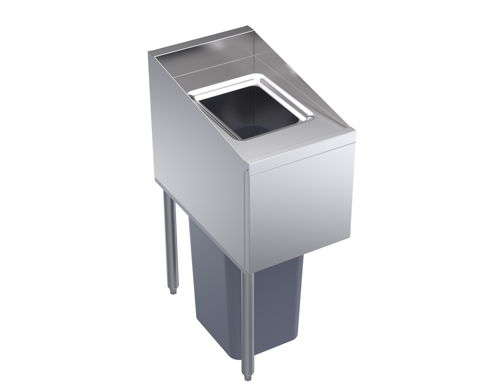 The Krowne KR24-T14L underbar trash unit’s door lifts up to facilitate liner removal and bin cleaning. Overall, it measures 14 inches long by 24 inches deep to match the speed rail, and its legs are located on the left. This trash unit fits Slim Jim containers as tall as 30 inches, while its top, front, and sides are constructed of stainless steel for optimal durability.