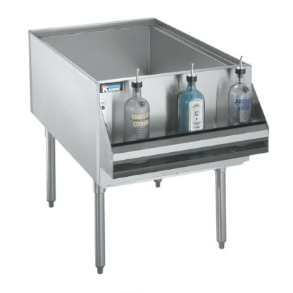 Royal Series Underbar Ice Bin/Cocktail Station, pass-thru, 10-circuit cold plate, 24″W x 35″D, 175 lbs. ice capacity, 10″ deep liner, 1″ drain, stainless steel construction, stainless steel legs with adjustable plastic bullet feet, NSF