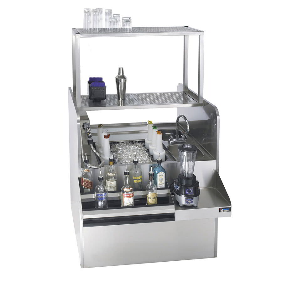 Royal Series Underbar Ice Bin/Cocktail Station, pass-thru combo, 42″W x 45″D x 45″H, 24″W pass-thru ice bin on left with 10-circuit cold plate, 24″W double speedrail, (2) dump sinks on right with (1) deck mount Royal Series gooseneck faucet (low lead compliant), 16″W blender shelf with duplex outlet, 18″D glass shelf with perforated insert & drain, includes 4″ tubing chase with soda gun holder, black laminated side panels, stainless steel construction, stainless steel legs with grey plastic bullet feet, NSF