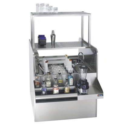 Royal Series Underbar Ice Bin/Cocktail Station, pass-thru combo, 54″W x 45″D x 45″H, 24″W pass-thru ice bin on left with 10-circuit cold plate, 36″W double speedrail, 12″W drainboard in center on server side, 12″W insulated bottle storage in center on bar side, (2) dump sinks on right with (1) deck mount Royal Series gooseneck faucet (low lead compliant), 16″W blender shelf with duplex outlet, 18″D glass shelf with perforated insert & drain, includes 4″ tubing chase with soda gun holder, black laminated side panels, stainless steel construction, stainless steel legs with grey plastic bullet feet, NSF