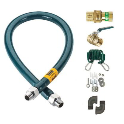 Royal Series Moveable Gas Connection Kit, 1″ I.D., 72″ long, stainless steel corrugated tubing & radial wrap with green antimicrobial PVC coating, quick disconnect, (1) full port gas valve, (2) 90° elbows, restraining cable with mounting hardware, 279,000 BTU/hr minimum flow capacity