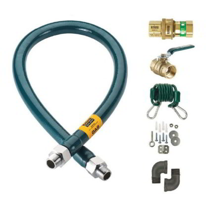 Royal Series Moveable Gas Connection Kit, 1-1/4″ I.D., 36″ long, stainless steel corrugated tubing & radial wrap with green antimicrobial PVC coating, quick disconnect, (1) full port gas valve, (2) 90° elbows, restraining cable with mounting hardware, 615,000 BTU/hr minimum flow capacity