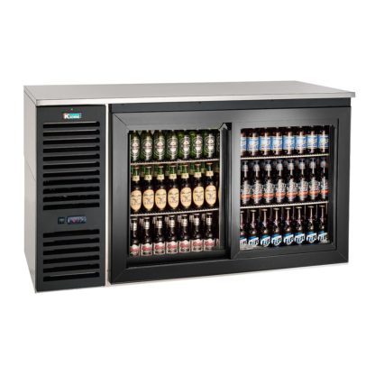 Sliding Door Refrigerated Back Bar Storage Cabinet, two-section, 60″W x 24″D, side mounted self-contained refrigeration, 30°-40°F temperature range, (2) sliding glass doors, (2) adjustable shelves & floor rack per door, LED interior lights, includes condensate evaporator pan, black vinyl front, stainless steel interior, R134a, 1/4 HP, 115v/60/1-ph, 6.0 amps, NEMA 5-15P, ETL-Sanitation