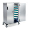 Elite Series Tray Delivery Cart, enclosed-type, two door, double compartment, (20) 14″ x 18″ or 15″ x 20″ tray capacity, (2) trays per ledge, 5-1/4″ spacing, 270° door swing, recessed handles, vented side panels, corner bumpers, (2) 6″ fixed and (2) 6″ swivel Lake-Glide casters, 2″ wide cushion tread tires, 200/300 stainless steel construction, NSF
