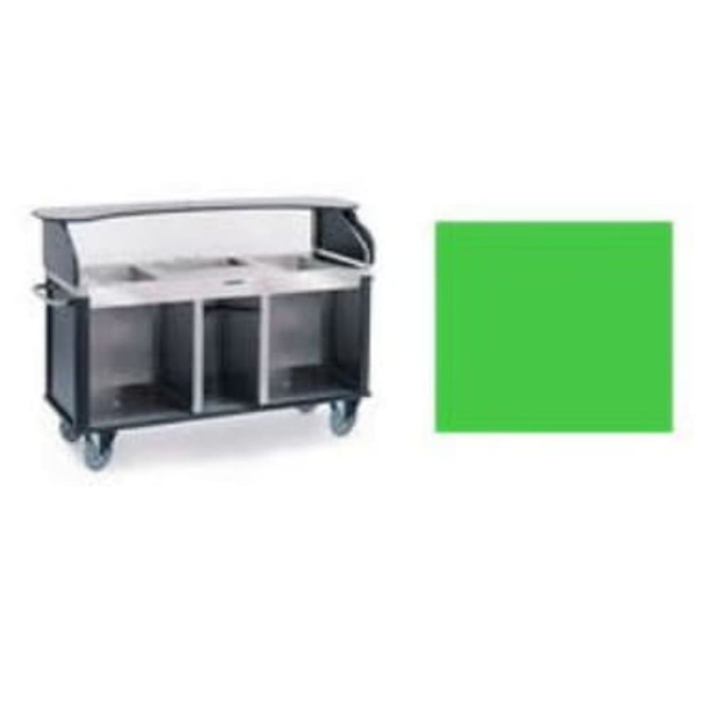 Serv’n Express Kiosk, mobile, 77-1/4″W x 28-1/4″D x 52-1/2″H, (3) full size pan inserts (full size pans not included), (1) slide-out laminate shelf in middle compartment, (3) interior stainless steel compartments, heavy-duty tubular push handles, stainless steel with laminate finish, 8″ casters ( (2) swivel with brakes, (2) swivel with lock), green