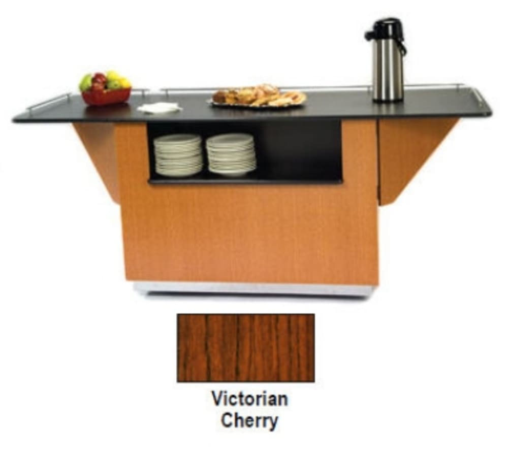 Breakout Dining Station, 87-1/4″W x 32-1/2″D x 38″H, drop leaf sides, (2) interior compartment with adjustable shelf, laminate serving surface with top railing on (3) sides, 4″ recessed non- marking casters, (2) swivel, (2) fixed, Made in USA