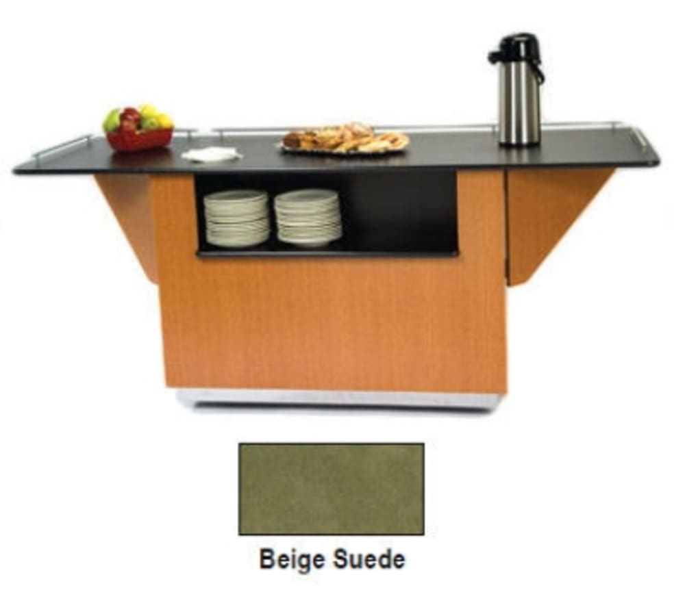 Breakout Dining Station, 99″W x 32-1/2″D x 38″H, drop leaf sides, (3) interior compartments with adjustable shelf in each, laminate serving surface with top railing on (3) sides, 4″ recessed non- marking casters, (2) swivel, (2) fixed, Made in USA