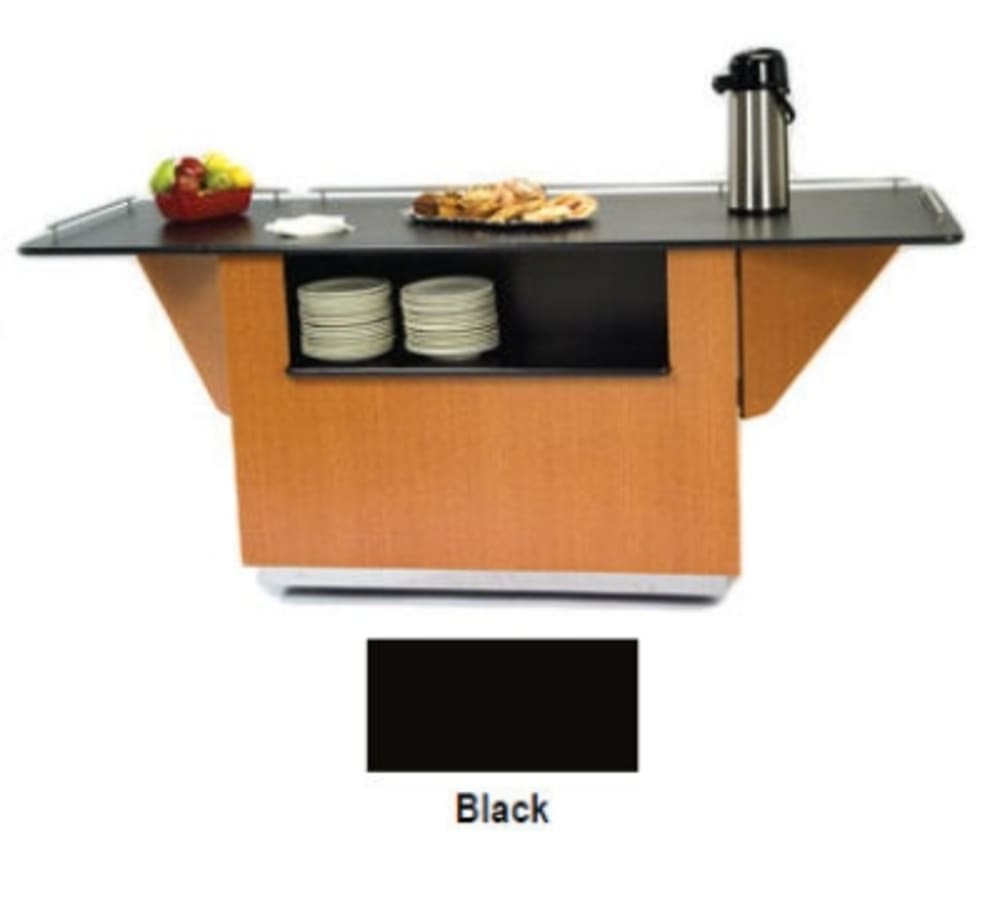 The Lakeside 6855 BLK dining station’s 95-inch-wide by 301/2-inch-deep top includes a 163/8-inch-wide by 301/2-inch-deep drop leaf on each side, maximizing the display area. Swing-out supports stabilize the leaves in place and add strength. To save space and ease transportation, the drop leaves can be folded down, and to preserve a clean, professional appearance, its top laminate resists water damage and stains. Stainless steel railing encases three sides of the top to keep contents in place as the cart is moved.