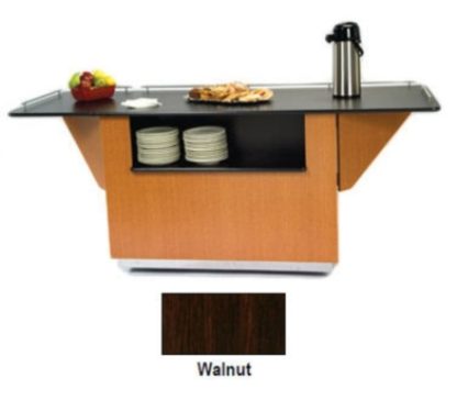 To accommodate food displays, the Lakeside 6855 WAL breakout dining station’s top measures 95 inches wide by 301/2 inches deep. The two fold-down drop leaves positioned at both ends add display space, and their swing-out supports add the rigidity needed to hold heavy items. Its stainless steel railing encases three sides to reduce the chance of contents falling during transport. The cabinet’s base includes an open, recessed dish storage area that accommodates plates and bowls for guest convenience. Additional items and supplies can be stored on the unit’s other side, which features three recessed compartments, and for enhanced organization, the left and center compartments include adjustable laminated shelves.