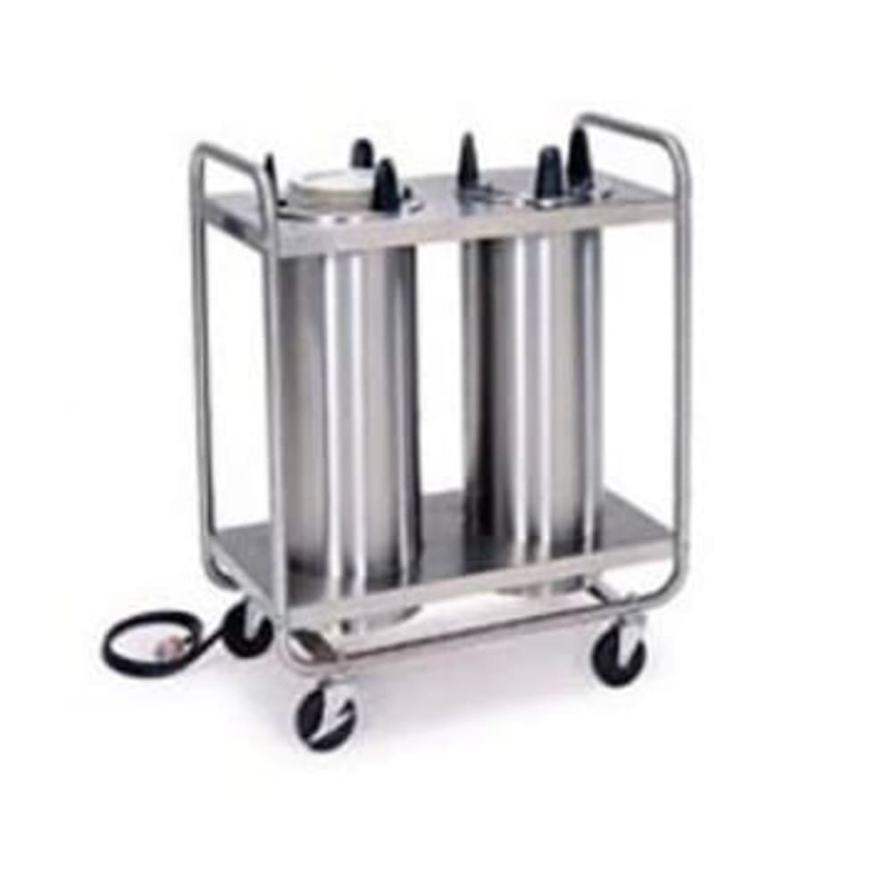 Dish Dispenser, heated, open tubular frame, mobile, (3) self-leveling dish dispensing tubes, Easy-Glide design, maximum dish size 5″ diameter, stainless steel construction, 4″ swivel casters (2) with brakes, 6′ cord with NEMA 5-15P, NSF, UL, Made in USA