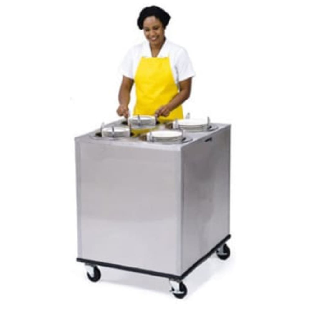 Adjust-a-Fit Dish Dispenser, heated, cabinet style, enclosed base, mobile, (4) self-leveling dish dispensing tubes, maximum dish size 7-1/2″ diameter, stainless steel construction, 4″ swivel casters (2) with brakes, 6’coiled cord with NEMA 5-15P, NSF, UL, Made in USA