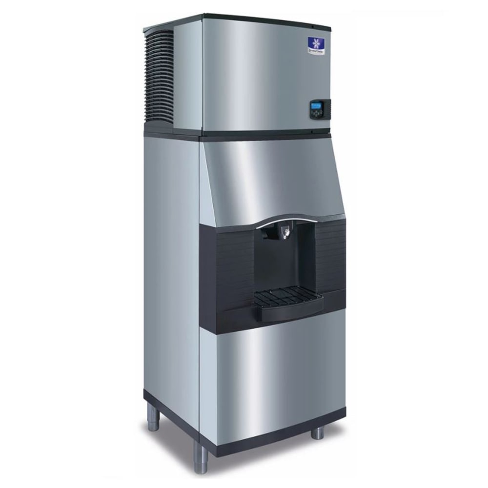 Producing half-size cubes of ice, the Manitowoc Ice IYT0300A-161/SFA292-161 ice maker with dispenser has an air-cooled, self-contained condenser that uses R404a refrigerant. It makes 230 to 310 pounds of ice daily, and the dispenser can hold as much as 180 pounds of ice. The dispenser can be used to distribute water as well as half- and full-size ice cubes, and it can fill a container as high as 11 inches. To reduce waste, its rocking chute prevents spills.