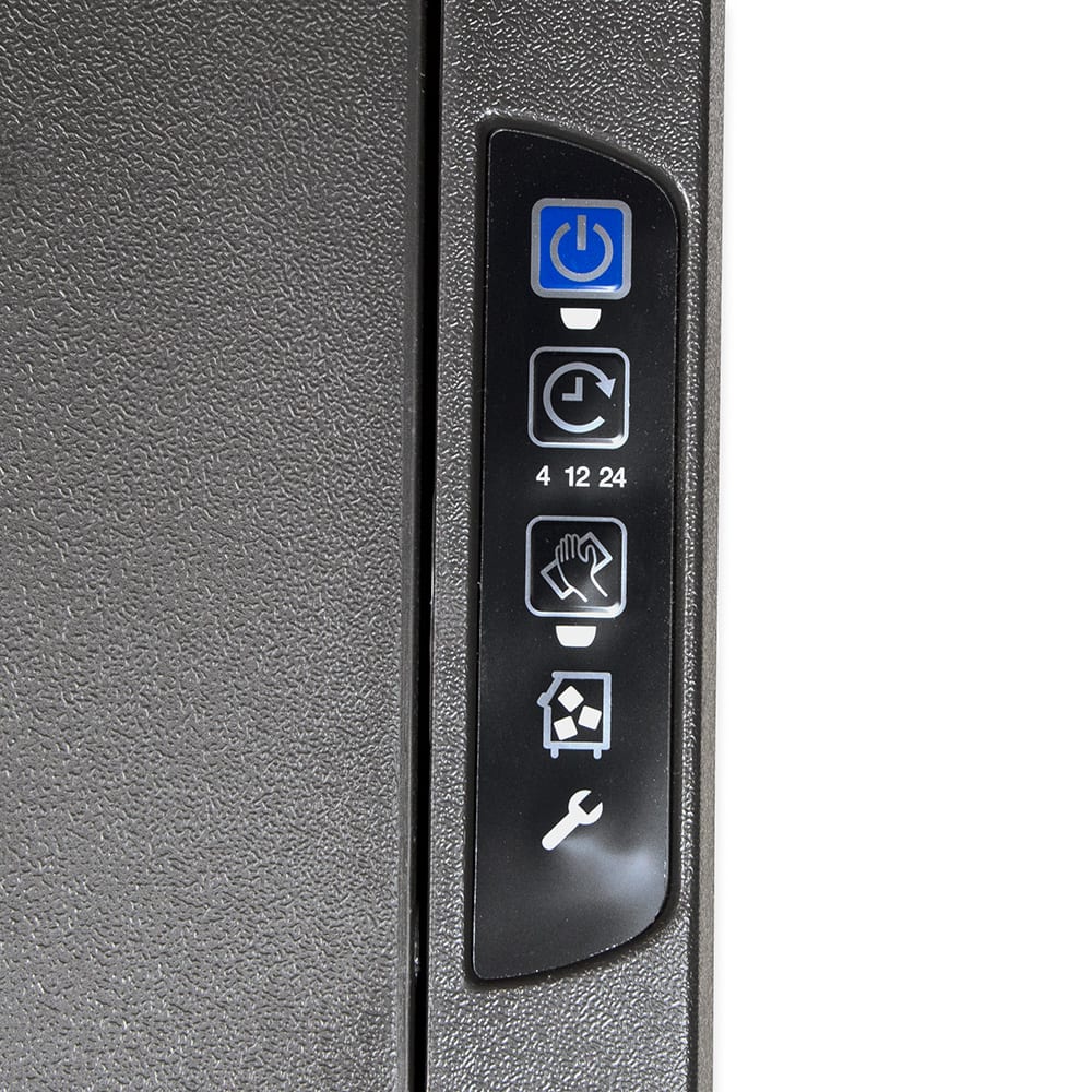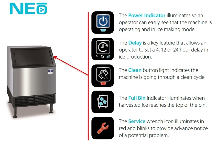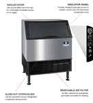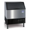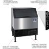A front air intake and exhaust design allows this unit to be placed next to other pieces of equipment and in tight spaces. Simple controls such as, “Power”, “Delay”, and “Clean” allow for you to customize when the machine is running and when it is stopped. This ensures that you are not wasting water and energy but having the machine running during slow periods and times when you are closed. Indicators inform you when your bin is full or when it is in need of servicing. This unit requires a 115V electrical connection for operation.