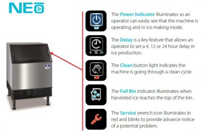 The Manitowoc NEO UYF-0310A is an undercounter ice machine that has truly revolutionized the ice machine world. It is designed to be better than previous undercounter ice machines, using 25% less water and 10% less energy than previous undercounter ice machines. The NEO combines some of the technology found in Manitowoc’s Indigo ice machines with the compact convenience of Manitowoc undercounter ice machines. The NEO is equipped with a Delay Feature so users can delay ice making for 4, 12, or 24 hours to keep the ice machine dormant while your business is not in operation. The Service Wrench Indicator illuminates in red when your ice machine faces issues, giving you an advance notice when your machine may require service. Even the scoop has been modified to make scooping ice easier and more productive. The UYF-0310A makes up to 290 pounds of dice cubes in a 24 hour period, and the self-contained bin can store up to 119 pounds of ice. The UYF-0310A measures 30 inches wide and stands 38.5 inches tall on 6 inch attached legs.