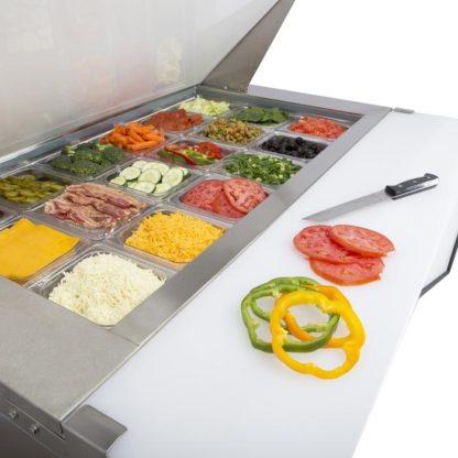 - Equipped with sanitary food grade quality 9″ cutting board, full set of divider bars and eighteen (18) 4″ deep pans