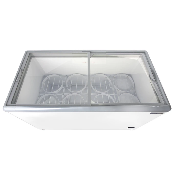 dipped ice cream or novelties. The glass top allows customers to
