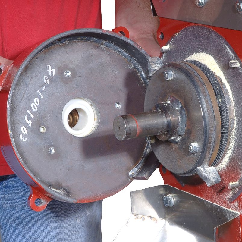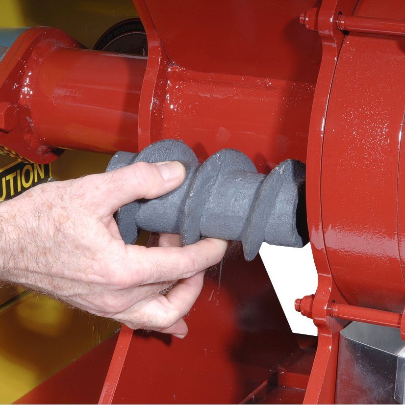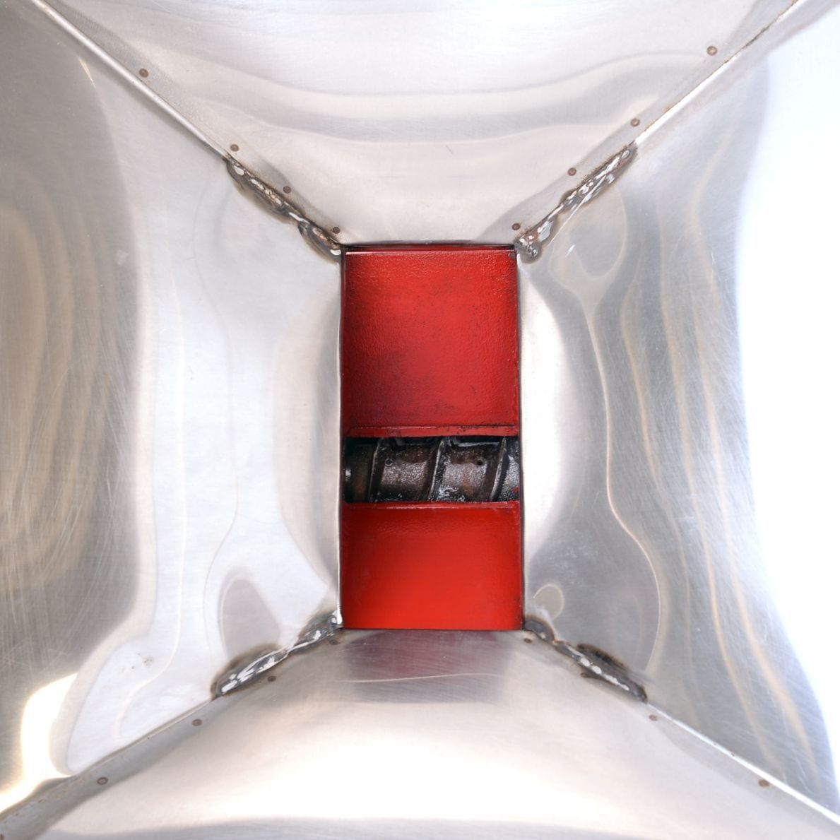 Most mills can grind only dry, flowable materials. This mill can grind dry, wet or oily materials because its burrs are non-porous and because it has an internal feed auger that forces nonflowable materials into the burrs. The mill inlet at the bottom measures over 2.5″ x 5″.