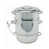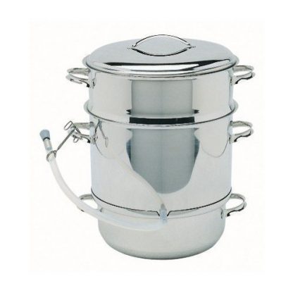 • Three part design: 11 qt. steamer basket, 4 qt. juice kettle, 1.25 gal. water pan. Includes lid & food-safe silicone drain tube with clamp.