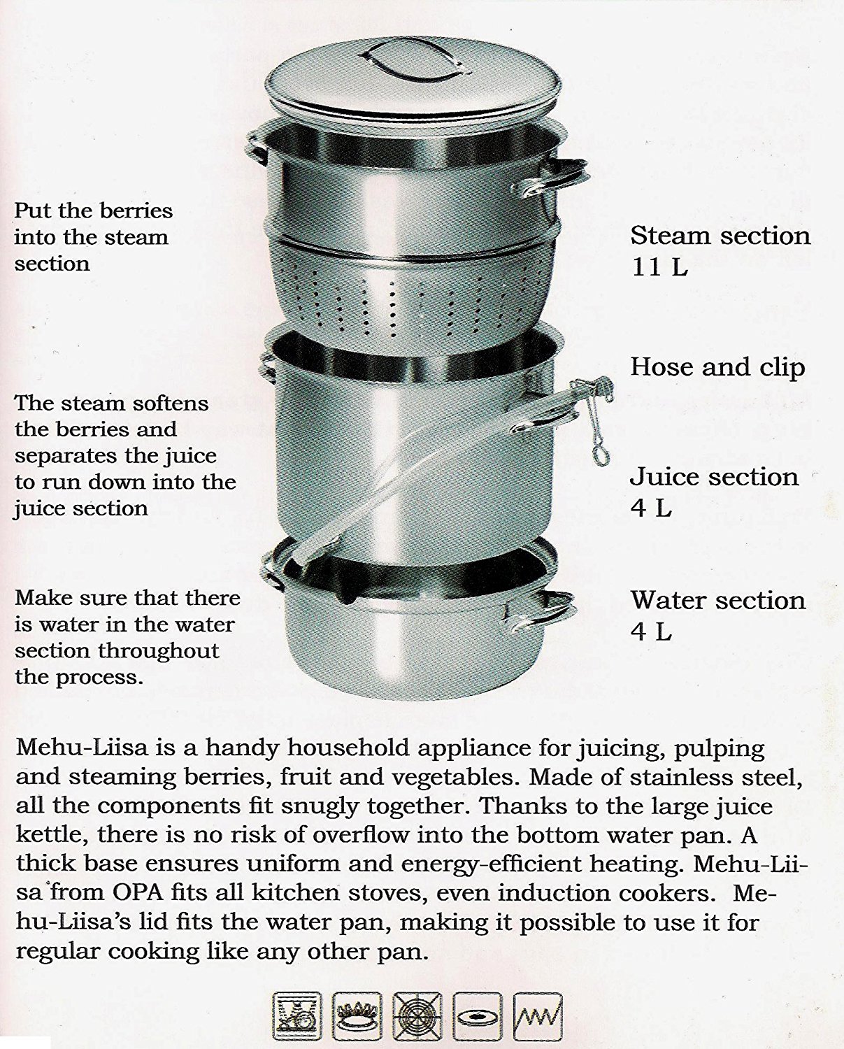 The best steam juicer for: Grapes, Apples, Pears, Currants, Raspberries, Strawberries, Rhubarb, Elderberries, Gooseberries, Huckleberries, Blackberries, Blueberries, Cranberries, Plums, Peaches, Pears, Crabapples, Tomatoes and more. Extract 100% pure, delicious juice from fruits and berries and steam cook complete meals. With No Mess. As Easy As Boiling Water! Your Mehu-Liisa Steam Juicer will save you hours of work – No more squeezing or straining! We offer the high quality 18/10 stainless steel craftsmanship and superior design that Finland is World famous for. You can make gallons of 100% pure, fresh juice and steam cook complete meals. A gentle steam process is used by Mehu-Liisa steam juicers to open the juice cells in fruit. Then the juice falls into the juice kettle and you drain it into bottles or jars. Never squeeze messy cheesecloth again!