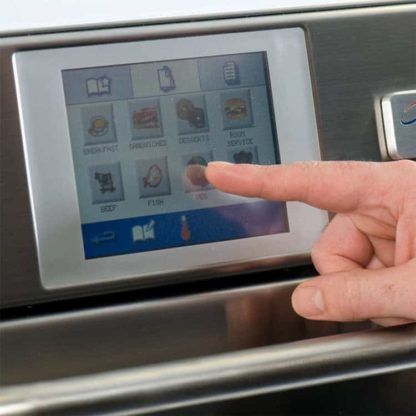 Because its convection fan draws in air from the back of the cavity for heating, the Merrychef eikon E4 convection oven doesn’t have a vent, facilitating quiet operation. It measures 23 inches wide by 25.3 inches deep by 23.3 inches high overall and has a 7.4-inch-wide by 12.3-inch-deep cavity, so it can be stored on a countertop to save on kitchen space. The bottom-hinged door lets users access the cabinet fully for swift loading and product retrieval. This unit’s exterior and interior are made of corrosion-resistant stainless steel to endure high-volume, daily use.