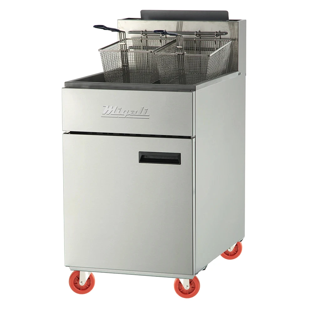 One popular option is the C-F50 model from Migali, it’s an all-purpose fryer that runs on propane and was designed with your needs in mind. It uses manual temperature controls. It stands on four adjustable stainless-steel legs with chrome accents. The frypot door and cabinet are constructed with stainless-steel. A set of twin, wire mesh fry baskets with blue plastic, coated handles are included and can be stored on basket hangers when not in use.