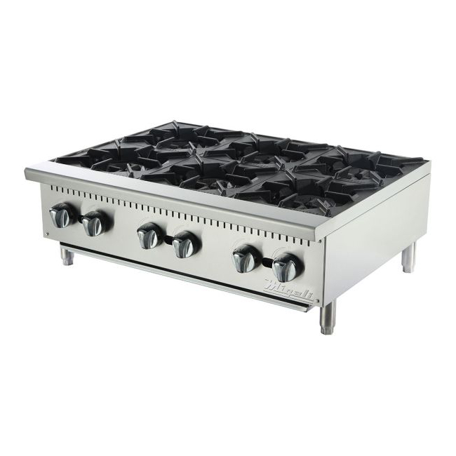 The Migali® C-HP-6-36 (6) burner, counter-top hot plate is excellent for cooking the very best appetizers and entrees. This model incorporates heavy-duty, cast iron trivets and a removable, full width slide out waste tray. Each Migali® Hot plate burner is rated at 32,000 BTUs and can be manually adjusted. Finally, the C-HP-6-36 is also eye catching, boasting a high polished stainless steel exterior and interior, (6) chrome temperature knobs and stainless steel adjustable legs.