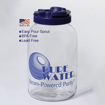 The Mini CT Glass Jar for Water has a lid with a pour spout that holds 1 gallon of liquid. Many people buy and extra jar to keep one in the refrigerator while the other one is collecting fresh distilled water. BPA Free. Lead Free. Made in the U.S.A. Put this jar in your refrigerator for delicious cold distilled water!