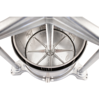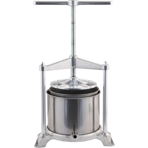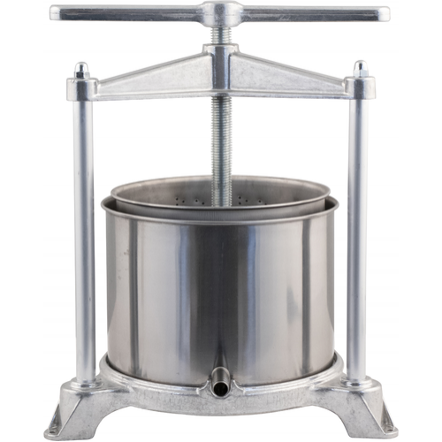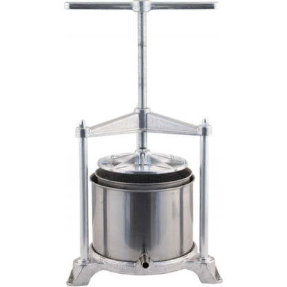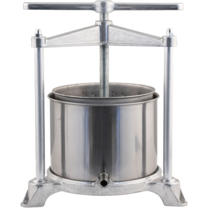 Our Mini press is great for pressing small quantities of fruit, herbal tinctures, cheese, and more. The stainless steel perforated basket keeps the product in, while the outer basin with pour spout direct the liquid to your collection container. The perforated basket and outer basin are made of stainless steel. The pressing plate and base are made from aluminum.