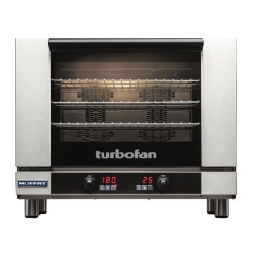 The E28D4 is a 31-7/8″ wide, electric, full-size stainless steel Turbofan digital/electric programmable convection oven from Moffat with (2) bi-directional reversing fans that delivers uniform airflow and a porcelain enameled oven chamber. There is a (4) full-size sheet pan capacity with 3-1/8″ tray spacing on this full-size stainless steel Turbofan digital/electric programmable convection oven. There is a pull-down twin pane glass door on the full-size stainless steel Turbofan digital/electric programmable convection oven with a Stay-Cool door handle.