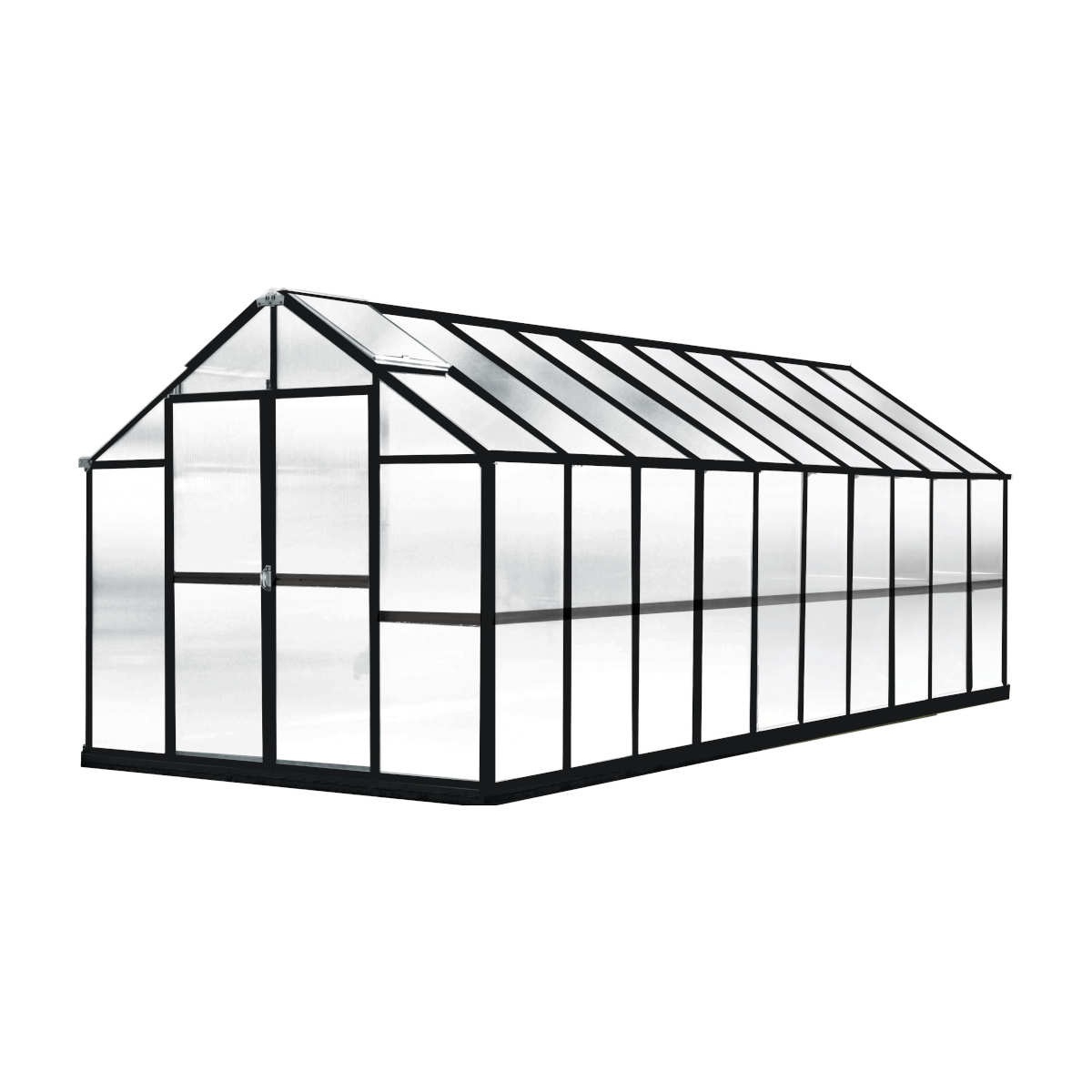 The Riverstone Monticello Growers Edition 8 ft x 20 ft Greenhouse Black  – Growers Edition is the ideal greenhouse designed for crops that require a lot of light in a private and secure setting. The Monticello is constructed from the highest quality extruded aluminum (US grade – not the thinner & more brittle foreign aluminum) and electrostatically painted Black (guaranteed to contain 0.0% lead). Proudly made in the USA.