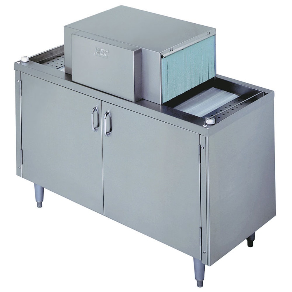 Glasswasher, pass-thru, 48″W, right-to-left operation, low temperature chemical sanitizing, approximately (2000) 2-1/2″ diameter glasses/hr, 10-1/4″ glass clearance, polypropylene conveyor, (3) built-in chemical pumps, fully automatic, cool fresh water rinse, cabinet base with doors, stainless steel construction, 3.0 kW tank heater, NSF, UL, CSA
