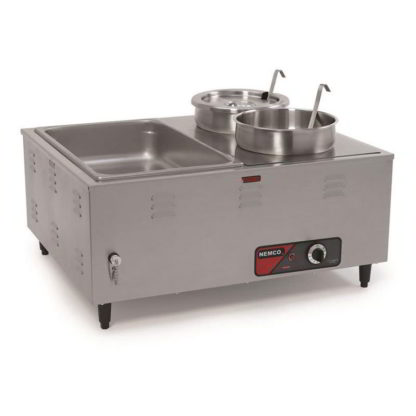 Mini Steamtable, 27-1/2″ x 24-1/2″ x 12-1/2″, constructed of brushed stainless steel, front drain valves, wet or dry operation, extra deep wells, precise, thermostats, temp. range 100-200°F, 120v/60/1ph, 1800 watts, 15 amps, 6′ cord and plug