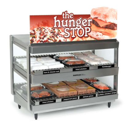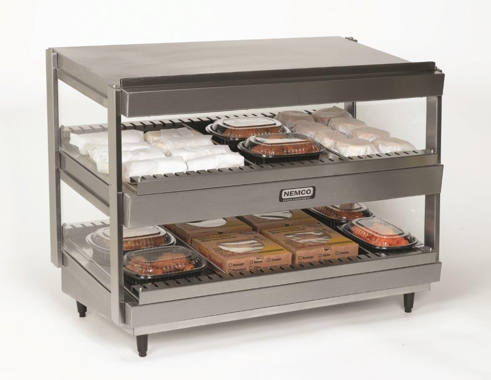 Shelf Merchandiser, 36 x 19-3/4 x 27-1/2″, aluminum dissipater plate, slanted dual shelf, independent heat & light controls per shelf, tempered glass sides, adjustable thermostat control & divider rods, stainless steel exterior, 120V/60/1ph, 15 amps, 1800W, NEMA 5-20P, UL, CUL, NSF