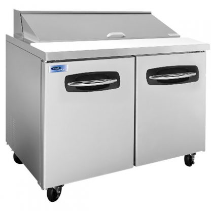 Quickly assemble any of your signature sandwiches with this Nor-Lake NLSP48-12 AdvantEDGE 48 1/4″ 2 door refrigerated sandwich prep table! Whether you need to make BLTs, clubs, tuna, chicken salad, or any other type of sandwich, this unit will safely hold your ingredients while expediting prep time. The worktop accommodates the included (12) 1/6 size food pans to provide you with instant access to lettuce, peppers, olives, and a wide variety of other ingredients, while a 9 1/2″ deep polyethylene cutting board offers plenty of prep space! The cabinet gives you even more room to store bulk ingredients for easy refills, and it features 2 epoxy-coated shelves for improved organization.