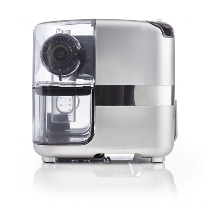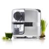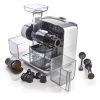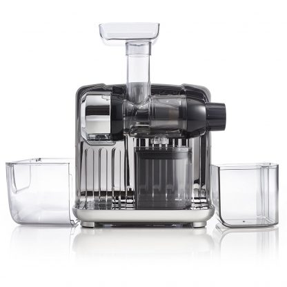 The Omega Juice Cube and Nutrition System. Square footprint and cube form factor. Excellent counter top appeal and a compelling industrial design. Convenient storage cavity in the back to store end caps and juice screen or homogenizing cone. Extract fresh juice from fruits, vegetables and leafy greens! Create nut butters, nut milks like almond milk or soy milk, and baby food, extrude pastas, make fruit sorbets or even use it as a grinder for coffee beans and herbs. The Juice Cube operates at low speeds of 80rpms and features a dual stage masticating extraction for optimum yield. It automatically ejects pulp into a separate container for easy, continuous juicing. The Omega Juice Cube chews through plant fibers and penetrates membranes to extract the fullest taste and highest values of vitamins and minerals from foods such as wheatgrass, carrots, and more.