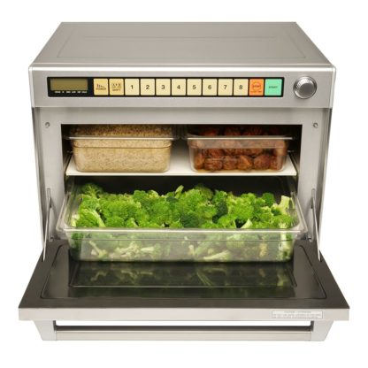 An alternative to traditional countertop steamers, the Panasonic NE-3280 commercial steamer microwave holds two full-size, 4-inch-tall pans. It has two levels, though the center shelf can be removed to accommodate taller pans, and this unit does not need to be placed under a hood ventilation system. It is connectionless, meaning it does not require hookup to a water line or have a reservoir, and steam in the unit is generated from moisture within the food when it is heated by magnetrons.