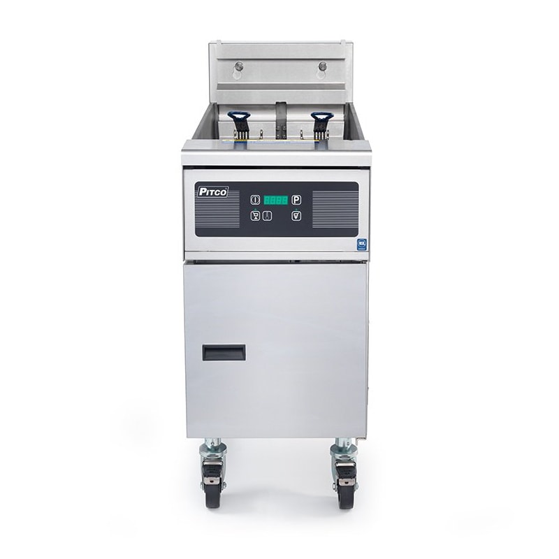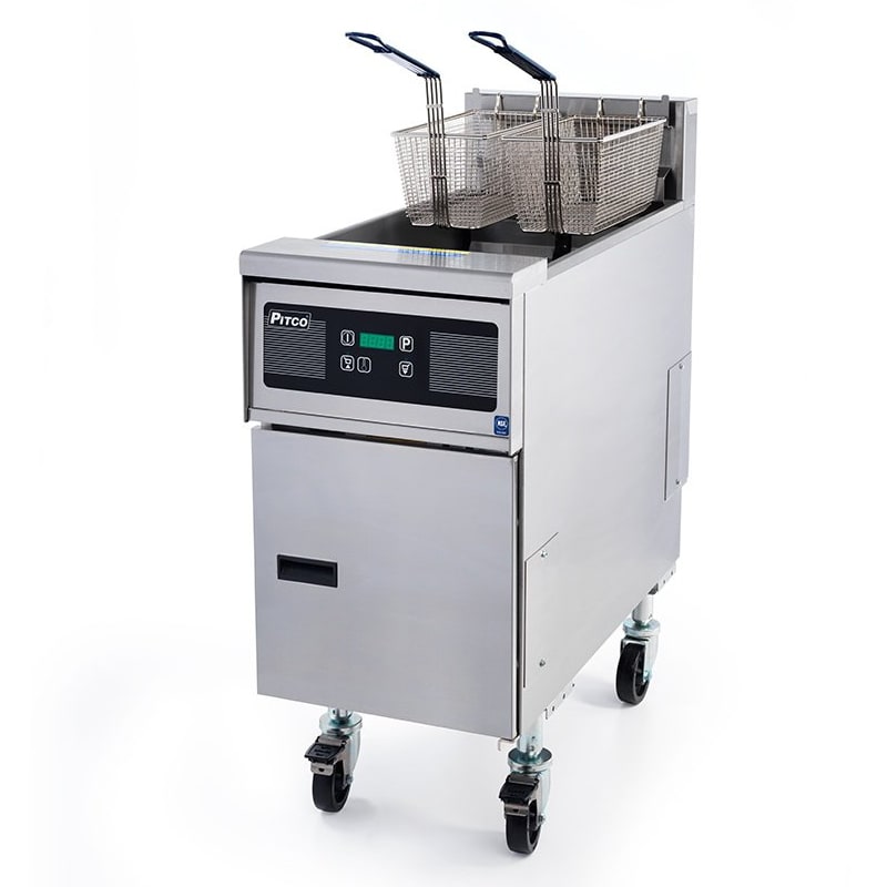 The Pitco SE14RS-1FD Solstice electric fryer works best for commercial kitchens with limited space. This fryer is a two-in-one product that fries foods and filters oil with its fryer tank and a two-step filter. Filtering oil keeps oil clean to ensure foods maintain a good taste while maximizing oil life and reducing food waste. By implementing fixed, ENERGY STAR®-rated heating elements, the fryer can accommodate 40 to 50 pounds of oil. Its stainless steel tank works with a filter pump for fast refills, and a self-aligning filter connection drains oil effortlessly. The filter pan includes rear wheels for smooth movement and a curved drain spout minimizes splashing when oil is disposed. Users can set the temperature and other filter cycles with the solid-state T-Stat, which includes a melt cycle and boil-out mode. However, if the unit gets too hot, a high-temperature safety limit switch automatically turns off the fryer to keep the kitchen safe.