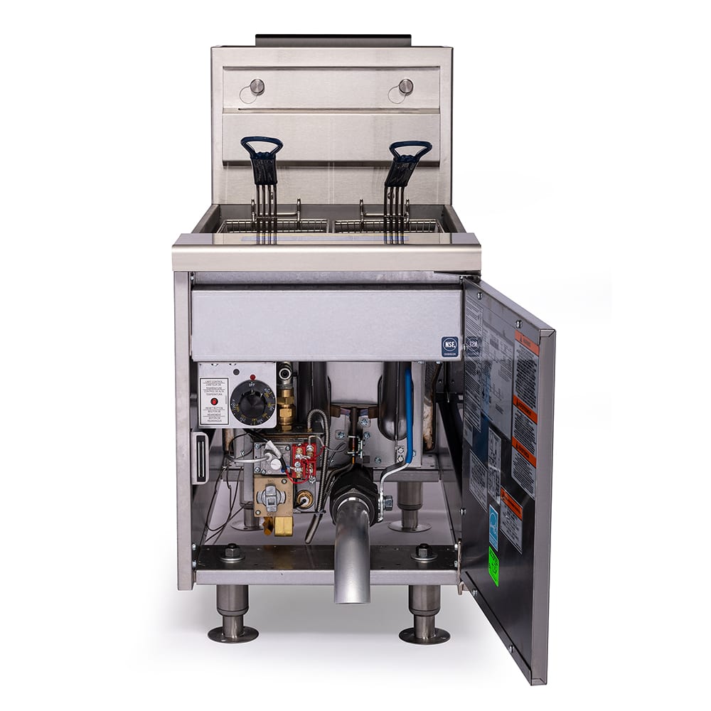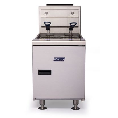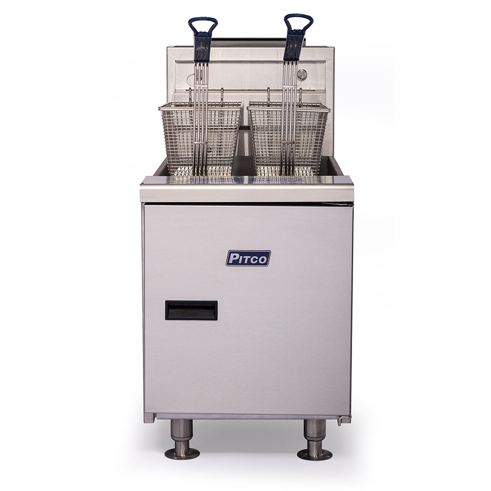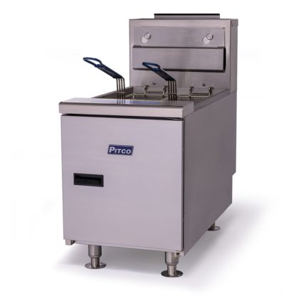 Enabling users to simultaneously cook mozzarella sticks in one basket and chicken tenders in the other, the Pitco SGC-S gas fryer has a 35-pound oil capacity and two frying baskets. Millivolt controls let users adjust the temperature from 200 to 400 degrees Fahrenheit, though the unit will automatically shut off if the temperature gets too high to prevent element burnout. For additional safety purposes, the unit also shuts off if the standing pilot flame goes out. To facilitate cleaning, the unit comes with a drain line rod and cleaning sample pack.