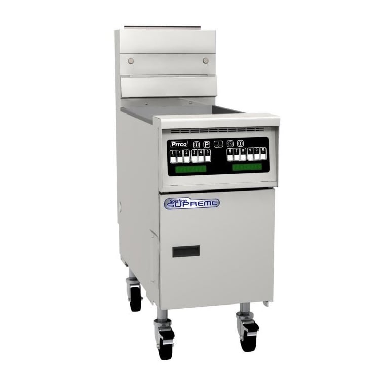 Ideal for use in high-volume restaurants and cafeterias, the Pitco SSH75 Solstice Supreme gas fryer has an oil capacity of 75 pounds. It features a boil-out mode to facilitate thorough, simple cleaning and a melt cycle so operators can work with solid shortening. This unit is designed with a removable basket hanger and comes with a fryer cleaning brush.