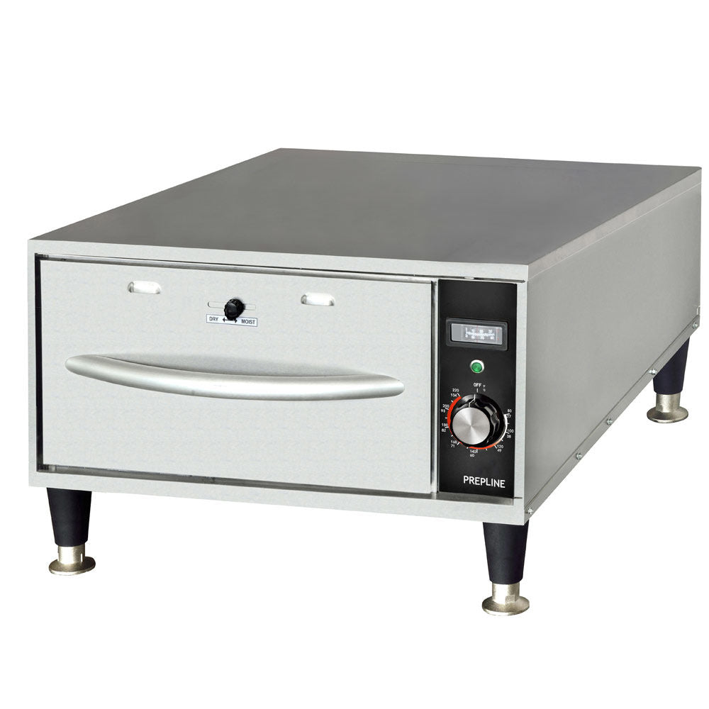 Prepline DWN1 single narrow freestanding stainless steel drawer warmer precise heat and humidity controls make it the perfect way to keep your breads, vegetables, and meats moist, flavorful, and at the ideal holding temperature until serving! It’s perfect for restaurants, cafeterias, dining halls, concession stands, and other foodservice establishments.