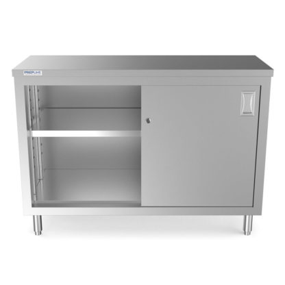 Prepline PC-1848 18″D x 48″L Stainless Steel Enclosed Base Work Table with Sliding Doors and Adjustable Shelf