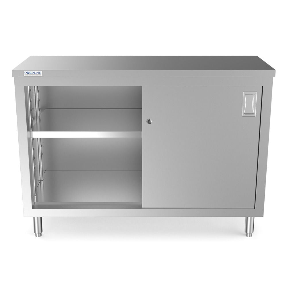 The Prepline PC series enclosed base worktable is ideal equipment for a busy commercial kitchen. With an ample stainless steel top work area, there is more than enough room to place small appliances such as a blender, meat slicer, or use it as a prep station. The sliding doors with recessed handle can conceal kitchen contents for storage. Need more space? The mid-shelf is adjustable and removable. Unleveled floor, no worries, the bullet feet adjust up and down with a twist.