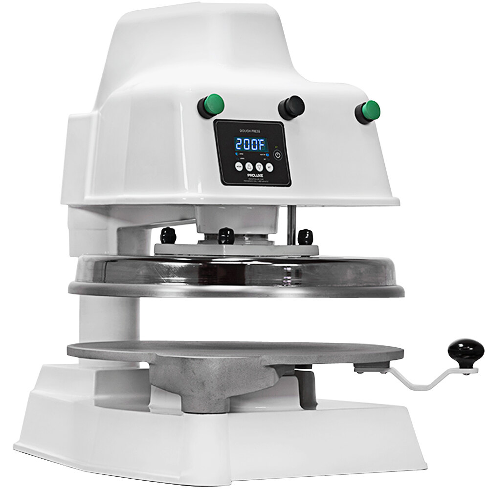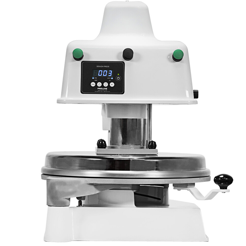 Flatten dough into uniform crusts with the help of this Proluxe Apex Pro X2M DP2350ME 18″ dual heated automatic hydraulic pizza dough press. This dough press saves you both time and energy thanks to its automatic design. Its dual heated platens work with this unit’s adjustable temperature control to heat to temperatures up to 450 degrees Fahrenheit and press dough to between 8″ and 16″ in diameter, using interchangeable molds (sold separately). Swapping out molds is easy, too. Simply lift the mold to unlock it from the press and replace it with your desired size to press larger or smaller crusts in seconds. A thickness control dial allows you to set how thick the dough should be pressed, so you can press dough for consistently crispy thin crust pizza or even doughy, stuffed crust. To make pressing easier, this unit features a programmable timer to ensure dough is pressed into perfect crust, so you won’t need to rely on skilled labor to create delicious pizza crusts. The embedded heating elements work quickly and efficiently to press dough to your desired thickness, decreasing your bake time without affecting the dough rise.