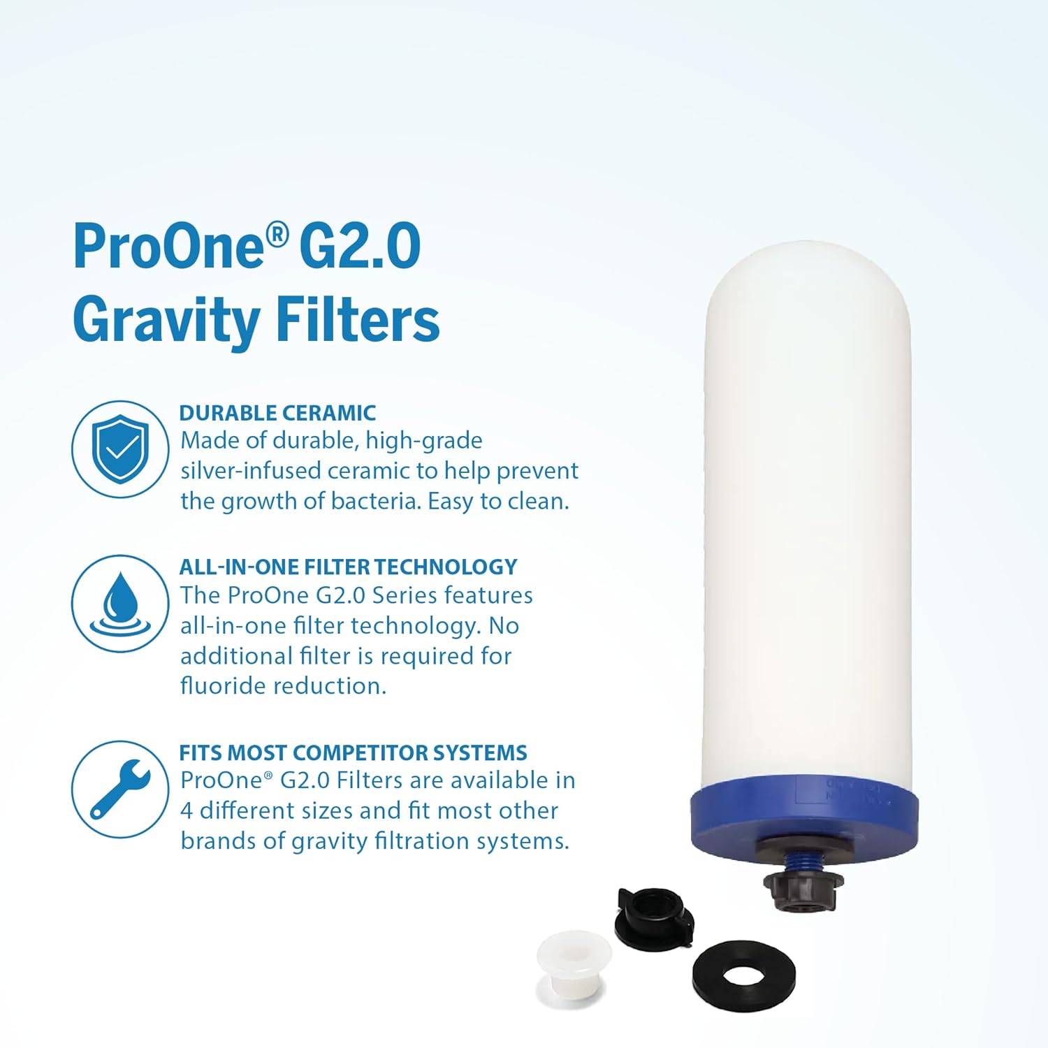 The ProOne® G2.0 filter by ProOne® is ideal for use with most water sources including lakes, rivers, streams, ponds, rain and tap water. The new ProOne® G2.0 “ALL-IN-ONE” CONTAMINANTS & FLUORIDE GRAVITY WATER FILTER combines silver infused white ceramic with new ProSorb™ granular activated carbon based media. In addition to primary contaminants, only the ProOne® G2.0 filter element helps reduce or remove heavy metals, fluoride, pesticides, herbicides, chloramines, bacteria, pharmaceuticals and more. The ProOne® G2.0 filter is easy to install, use and clean – no priming required and no additional add-on filters necessary to remove fluoride. The ProOne® G2.0 “ALL-IN-ONE” CONTAMINANTS & FLUORIDE GRAVITY WATER FILTER has been tested to meet NSF/ANSI standards 42 & 53 and NSF/ANSI Protocol P231.