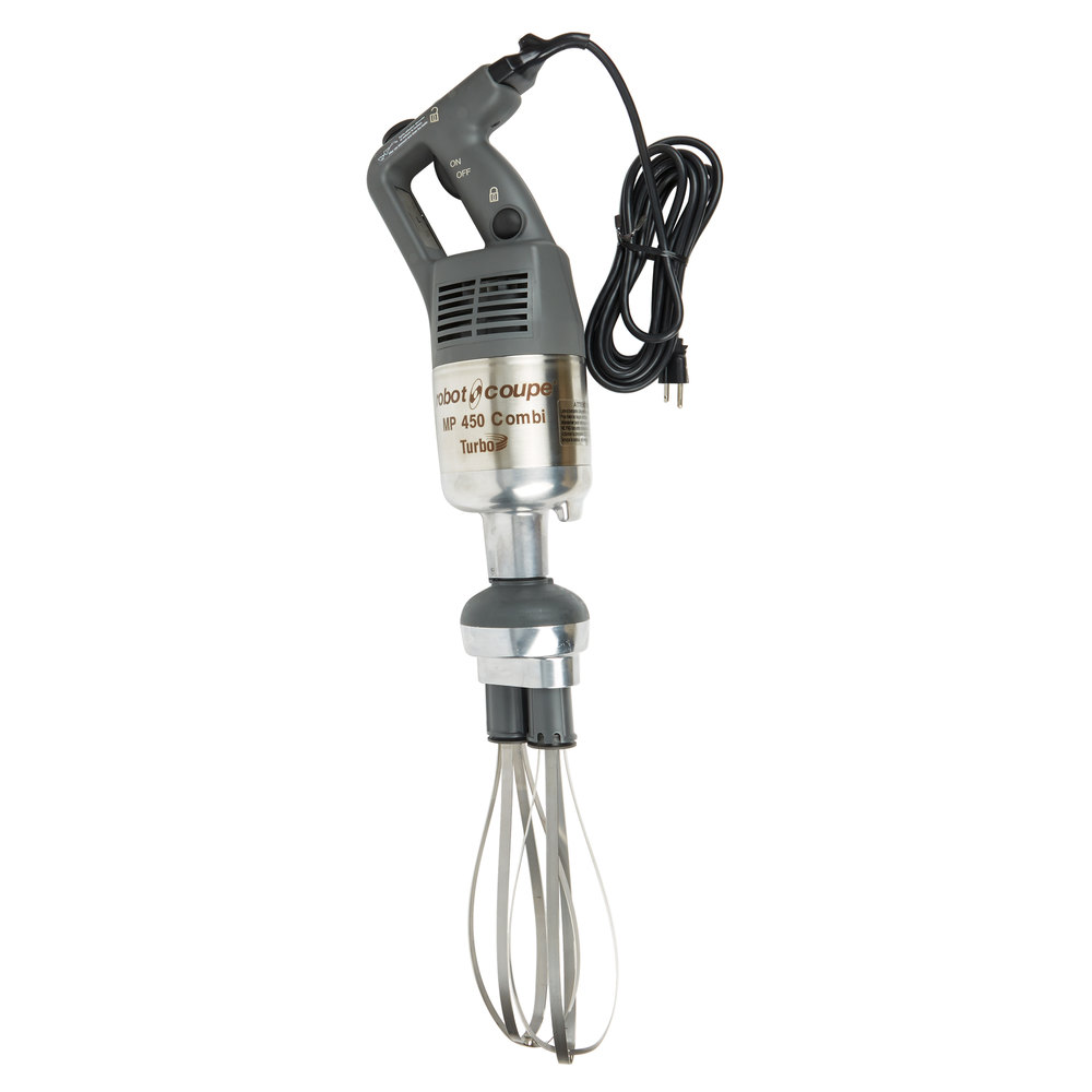 Easily and quickly power your way through fruits, vegetables, soups, sauces, and more with the Robot Coupe MP450 Turbo Combi immersion blender! This unit boasts an ergonomic handle and 1.1 hp motor with the ability to be a traditional stick blender or a powerful handheld whisk mixer! Its speed self-regulation system helps achieve great results each time, while achieving speeds between 500 and 10,000 RPM depending on the attachment. Also, replacing the power cord if it becomes worn or frayed isn’t a problem because it was engineered to easily detach from the unit.