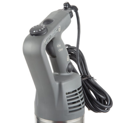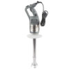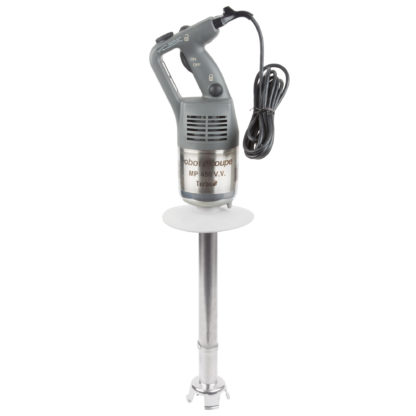 Easily and quickly power your way through fruits, vegetables, and more with the Robot Coupe MP450 Turbo VV 18″ variable speed immersion blender! This unit boasts a 1 hp motor with variable speeds between 3,000 and 10,000 RPM that gives you optimum control over your blending. The 18″ shaft is great for liquefying, pureeing, and blending to make delicious soups, sauces, pates, and more in your commercial kitchen. Also, replacing the power cord if it becomes worn or frayed isn’t a problem because it was engineered to easily detach from the unit.