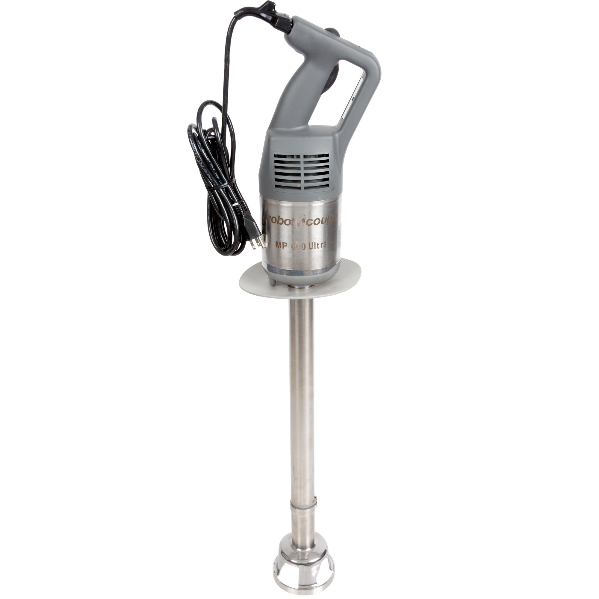 Easily and quickly power your way through fruits, vegetables, and more with the Robot Coupe MP600 Turbo 23″ immersion blender! This unit boasts a 1.5 hp motor with speed self-regulation system to achieve great results each time. This Turbo blender’s 23″ shaft is great for liquefying, pureeing, and blending to make delicious soups, sauces, pates, and more in your commercial kitchen. Also, replacing the power cord if it becomes worn or frayed isn’t a problem because it was engineered to easily detach from the unit.